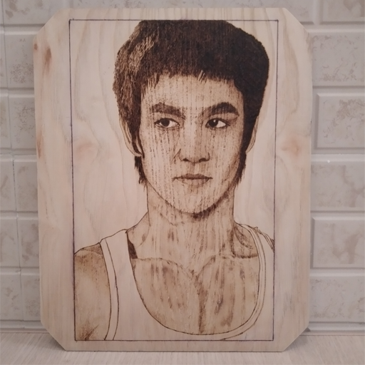تابلو چوب سوخته نگاری طرح بروس لی اجرا شده روی روکش ون سایز 22×27 سانتیمتر۸۰۰٬۰۰۰ تومان
