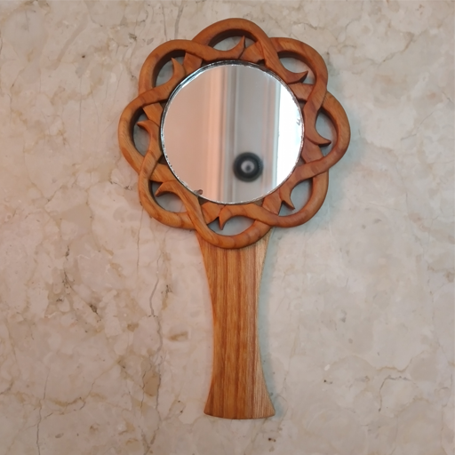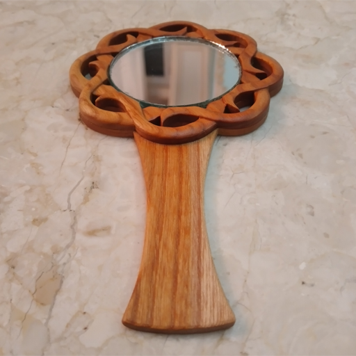 آینه دستی چوبی معرق منبت طرح پیچک سایز 17×10 و قطر آینه 6 سانتیمتر