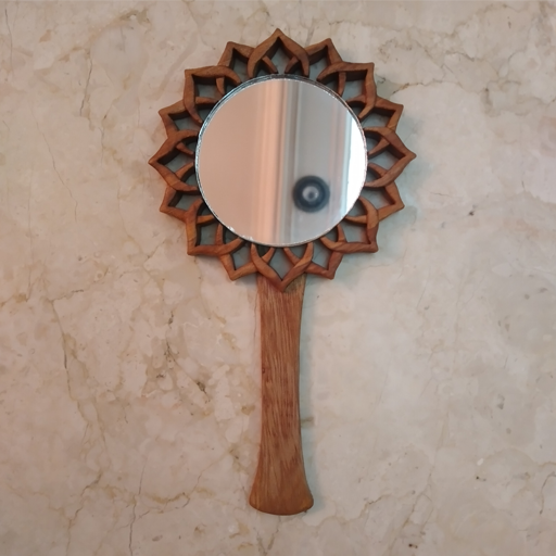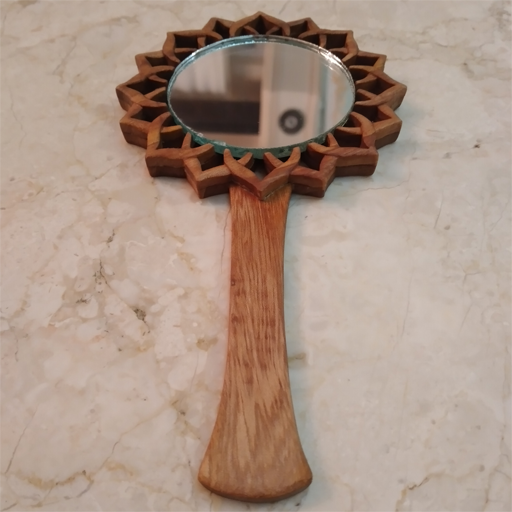 آینه دستی چوبی معرق منبت طرح آفتابگردان سایز 10×17 و قطر آینه 6 سانتیمتر