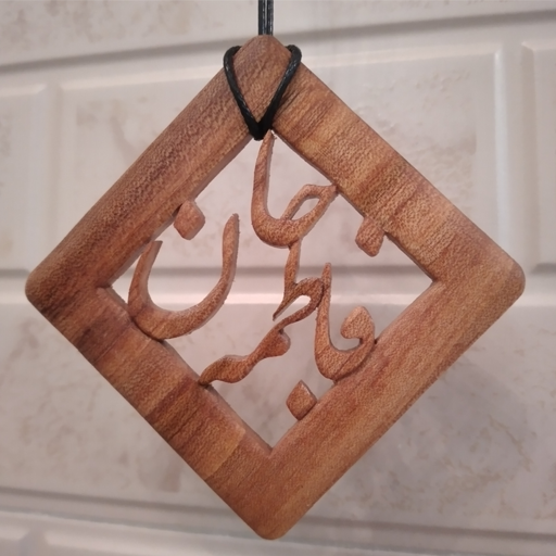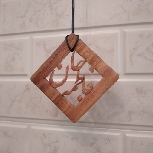 گردن آویز چوبی معرق منبت طرح فاطمه جان سایز 75×75 میلیمتر