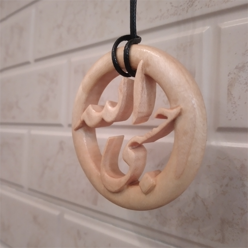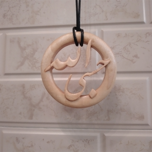 گردن آویز چوبی معرق منبت طرح حسبی الله از جنس چوب افرا به قطر 6 سانتیمتر